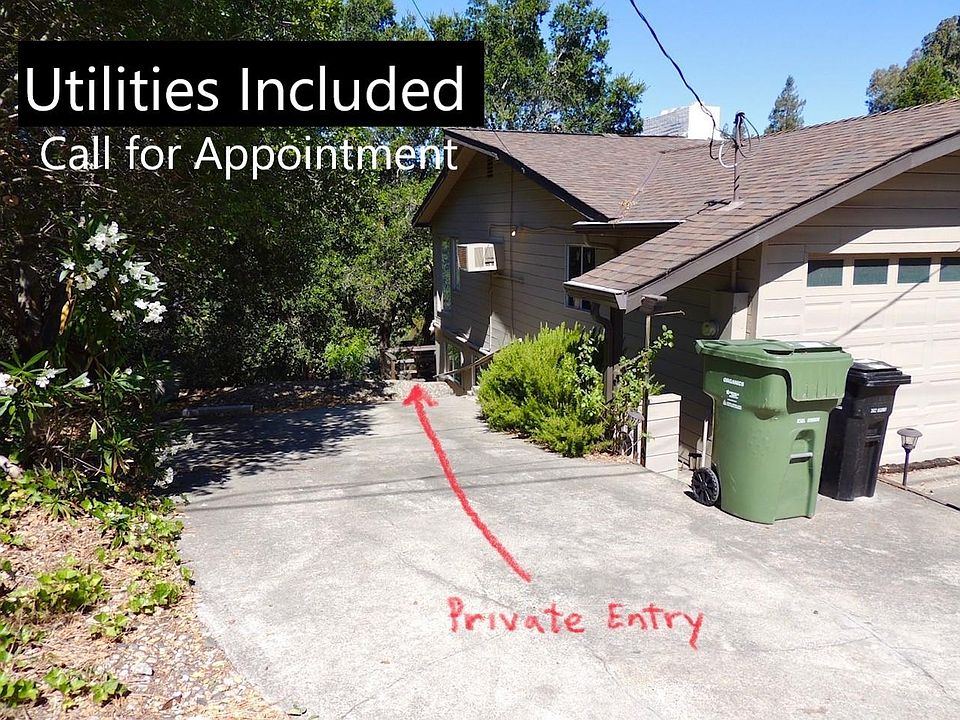 Fully furnished or unfurnished. Available December 1st, call for tour. Lower unit (nearly 1000 sf) in quiet Deerhill neighborhood, uphill, north from downtown. Private, fenced redwood deck (extra 500+sf.) Off-street parking for two vehicles. Easy access to Highway 24 and less than a mile to BART and blocks to shopping. Includes the following utilities: gas, electric, water, trash, and premium Comcast: internet wi-fi and cable for two TVs, included. Full kitchen, with Italian tile, has pantry closet featuring new stacked washer/dryer. Also included are dishwasher and garbage disposal. Kitchenware, utensils, and small appliances are also supplied. The carpeted great room has a large closet hidden by new Barn-style door (95" wide by 36" deep). Nice space for office or storage. Bedroom, also carpeted, has many custom cabinets (most 33" deep) including mirrored cedar closet. Gated, full length redwood deck (45' by 13') is perfect for relaxing, entertaining, or working from home. Recently painted. Single or Double occupancy. No smoking or illegal drugs. One small pet negotiable. Call (landline) for tour. Ask for Dean or Rose. FULLY FURNISHED UTILITIES INCLUDED: gas, electric, water, trash, premium cable. Wi-Fi. Off street parking. Single or double occupancy. Month to month. $300.00 Cleaning deposit. No smoking or illegal drug use please.