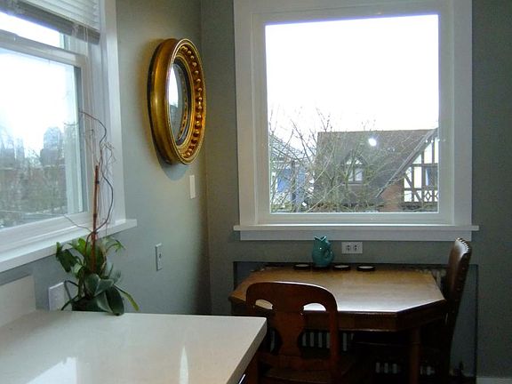 Bright corner view unit with new conveniences and old world charm in prime Capitol Hill neighborhood near Kaiser Permanente. Hard wood floors, new kitchen and appliances, dishwasher, tiled bath, bay windows, open sky and Olympic mountaintop view. Building a little shaggy on the outside, beautiful and well-maintained inside. Walk to 15th Avenue shops and restaurants and groceries, major bus lines. Two parking spaces available, shared laundry onsite. Absolutely no pets or smoking. Email, phone or text Ann with questions or to see video walk-through. First, last & $800 fully refundable deposit. Landlord pays water/sewer/garbage, resident pays electric.