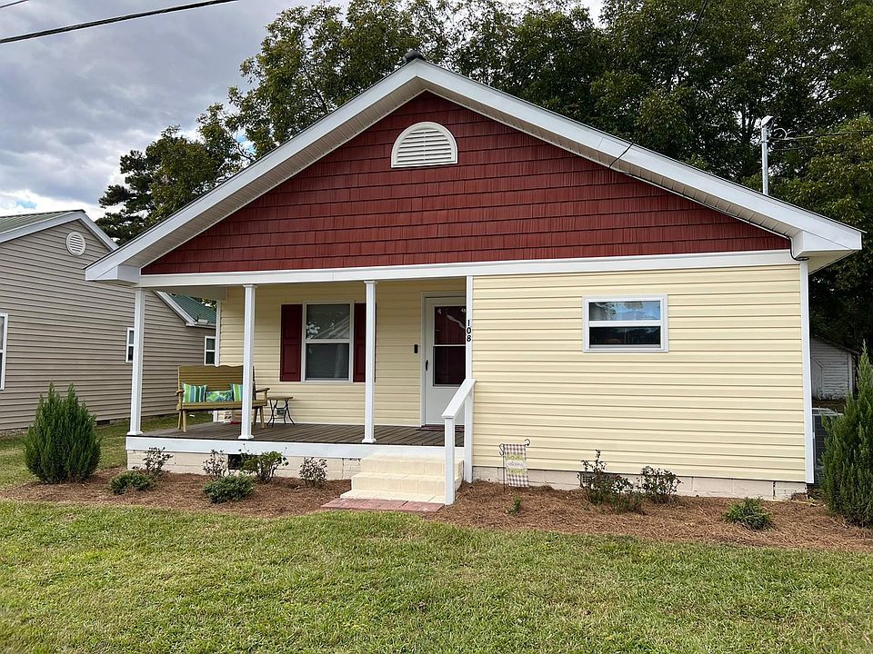 Cute and cozy updated ranch style home, remodeled in 2022. Covered front porch, great for a set of rocking chairs. Kitchen has a white subway tile backsplash, newer white kitchen cabinets and granite countertops, with a stainless steel electric stove, large open kitchen, perfect for a farm table, refrigerator negotiable, spacious family room with masonry gas log insert. Updated bathroom with double vanity, tile floor and tub/shower. Large utility room with a back door access to a fenced in yard. Great for first time home buyer, move in ready!