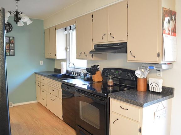 Cozy, cute, and charming are just a few words to describe this home! This home has been well loved and it shows! The kitchen has been updated with black appliances, dishwasher added, counter tops, sink and faucet, and lighting fixtures. The galley kitchen has ample cabinets and offers a spacious dining area, this home really feels much larger than it appears. The bathroom has been updated with tile flooring, vanity, tub surround, and lighting fixtures too. The lower level has a large room that feels finished and makes for a great entertainment area! The oversized one stall garage has tons of extra storage space, and an additional parking slab has been poured for additional parking. The front deck has also been completed since purchase and, along with the patio in the back, fenced yard, offers great outdoor space when the weather cooperates! Many newer windows and doors!