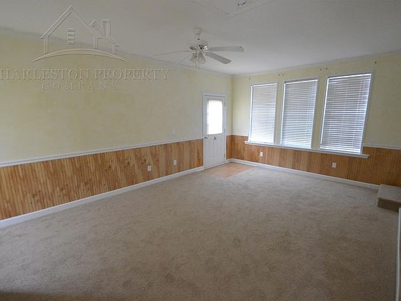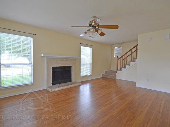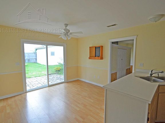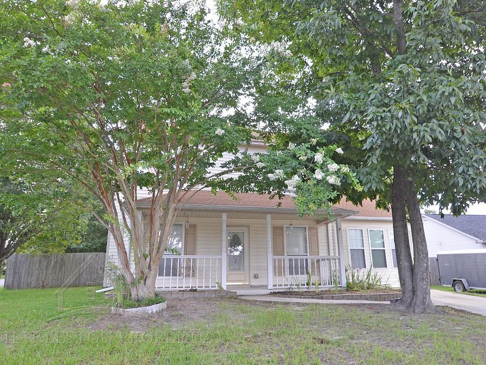 This three bedroom, two story home is centrally located in Goose Creek in Greenwich Hall. The home greets you with a porch with a swing ready for you to enjoy on a corner lot with plenty of space. There are hardwood floors in the dining room, kitchen, and living room. There is a finished garage with carpet that makes for the perfect media or extra family room. There is a sliding glass door off the dining room that takes you to a fully fenced in back yard with a patio and a work shed with shelving. The kitchen is spacious with an open bar are perfect for entertaining. Off the kitchen is a laundry room where a full size washer and dryer can fit. Upstairs is a master bedroom with vaulted ceilings, ceiling fan, and a full bathroom on one side of the hallway while the other boasts the two guest bedrooms both with closets and ceiling fans.