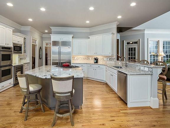 ENTERTAINER'S DREAM HOME! Beautifully updated kitchen w/ white cabinets & granite countertops. SS appliances. Large open floor plan. Formal LR looks out to screened-in back porch. Large deck overlooks private wooded lot. 3 car garage. 4 FP's. Spacious owner suite w/ walk in closets. Finished terrace level includes movie rm w/ secret door behind bookshelf, temp controlled walk in wine cellar, bed/bath, & patio. Landscapers dream w/ planted flowers, ornamental trees, & natural woods. Plus flagstone patios & walks! Neighborhood is adding 1 Gig Fiber internet early 2018.