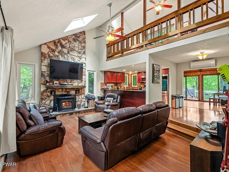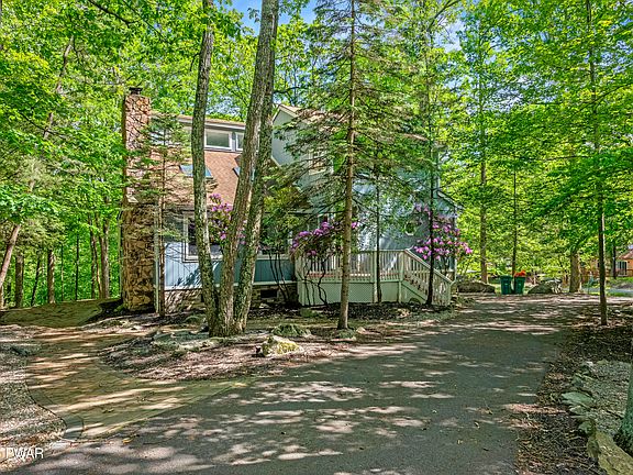 MOVE-IN READY & FULLY FURNISHED - JUST BRING YOUR BUYERS! Welcome to your turnkey dream home, perfectly situated in the amenity-filled Penn Estates community in the heart of the Poconos. This beautifully maintained property is being offered fully furnished, including bedroom sets, living/dining furniture, loft essentials, and even exercise equipment--all for one price!SELLER IS MOTIVATED - DON'T MISS THIS OPPORTUNITY! This home is also short-term rental (STR) friendly, making it an ideal investment or year-round retreat. Enjoy seasonal lake views and breathtaking sunsets over Highland Lake in the fall and winter. Come spring and summer, bask in privacy with mature trees surrounding your expansive deck and enclosed all-season sunroom--featuring sliding glass doors on all sides for a seamless indoor-outdoor experience. Key features include: Newly painted deck with built-in seatingKayak storage and tasteful paving, landscaping, hardscaping, and motion lighting, Camera security system included, Sunken living room with stunning stone fireplace and Harmon pellet stove insert, Skylights that bathe the living space in natural light, Updated kitchen with granite countertops and stainless steel appliances, 2 bedrooms and a fully updated bathroom on the main floor, Private upstairs primary suite featuring a whirlpool tub, large tiled shower, skylight, private balcony, and walk-in closet, Loft area overlooking the living room - perfect as an office, den, game room, or additional sleeping space,Basement with 2-car garage, laundry chute, and workout room, Private corner lot with circular driveway, professional landscaping, and pavers. Recent updates include: New heat/AC pump on the main floor, New water heater (2025), New windows (2019). Located just minutes from Camelback Resort, The Crossings Outlets, Route 80, shopping, and dining, this property offers the best of Poconos living--whether as a full-time residence, weekend getaway. SCHEDULE YOUR PRIVATE TOUR TODAY!