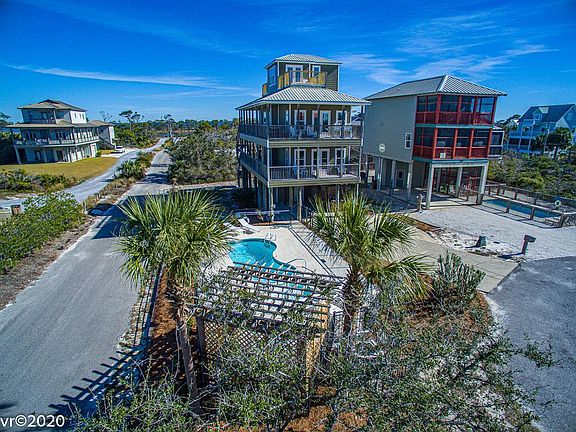 X Flood Zone first tier house with a heated pool that is turn key for rentals. Excellent rental history of over $77,000+! This home has both beach and bay access so that you can watch the sunset over the Gulf or the sunrise over St. Joe Bay. The first level reveals two sizable master suites; one overlooking the Gulf and pool and the other overlooking St. Joe Bay. The 2nd level presents the main living area, additional bath and bunk room. The observation room on the top floor has the best views of the bay that I have seen on the Cape! It also includes a sleeper sofa which provides an additional sleeping room! Deluxe outdoor shower, gated pool area with pergola and plenty of room for outdoor entertaining. Gulf Beaches are only steps away! Whether you are looking for a second home, or an income producing property, this one fits the bill!