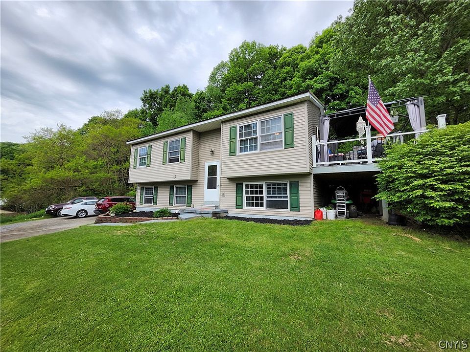 Enjoy life in the village while tucked away on a newer cul-de-sac neighborhood set up on a hill and backing to woods. Be sure to come see this well laid out split level home with beautiful French doors to large composite deck overlooking private yard. Interior offers 1st floor bedroom, full bath and family room. Upper level has living room, kitchen/dining area and 2 bedrooms + 1 Bath. *Save money with Groton Electric Co-op!! Large side yard is partially fenced and lined by woods behind and fronting all the way to Spring St..
