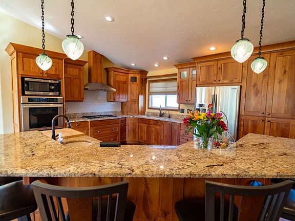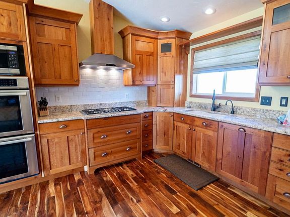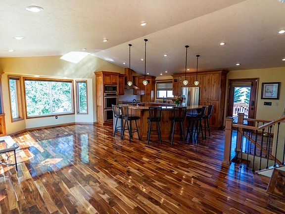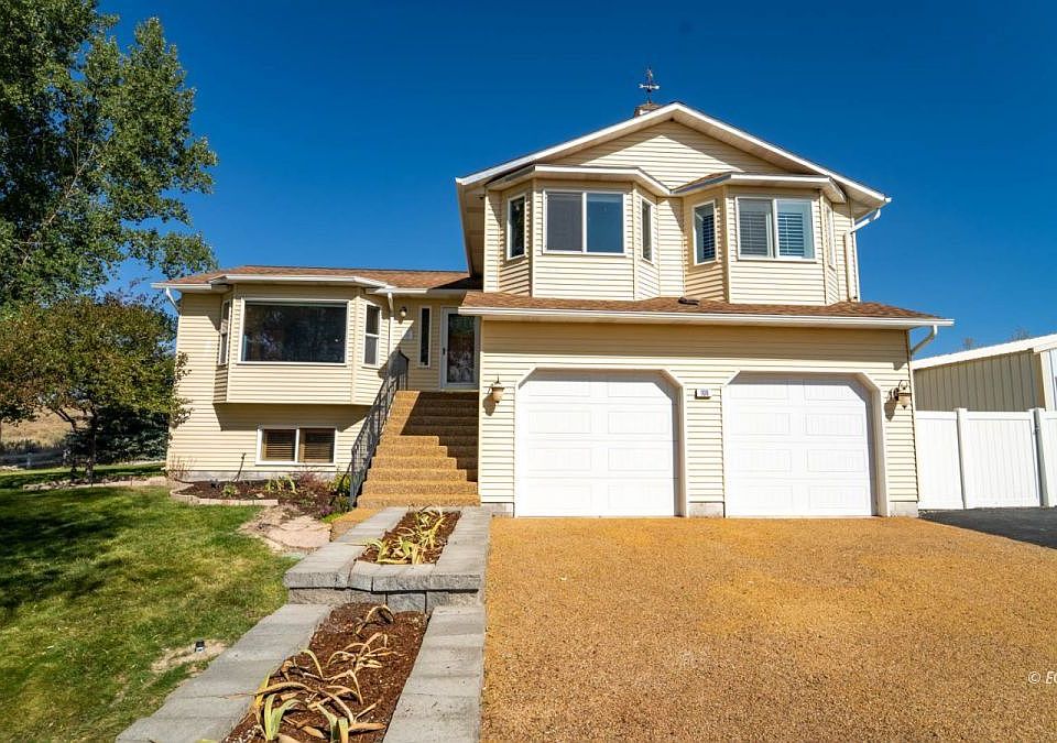 This is a home you don't want to miss! Updated throughout & pride of ownership all around. 4 bedroom 3 full baths compliment this home. When you walk in you're greeted to open kitchen dining and living room area with custom fireplace and blinds. Beautiful acacia wood floors. The kitchen is a cooks dream! Plenty of counter and cabinet space, a raised eat in bar and a coffee bar area with wine fridge. A door out to the private yard where there's 800 sf of deck, horseshoe area w/drink holders and hot tub that stays w/no warranty. Upstairs features laundry area w/cabinets, master suite with built in fireplace and upper deck access to hot tub. Two additional bedrooms with lots of storage. And a second bath. The lower family room has a gas stove and the basement has a 4th bedroom and full bath with concrete counter top. The basement area could be an office or great place to home school or man cave. Asphalt driveway, the shop has heat/electrical along with attic storage and dog door to dog kennel in the back. Garage has built in storage. There are raised beds & pebble walkway and pad There is nothing that was overlooked or missed in this home that is move in ready.