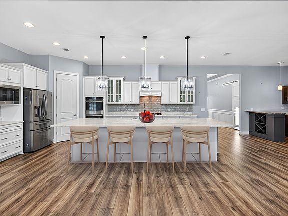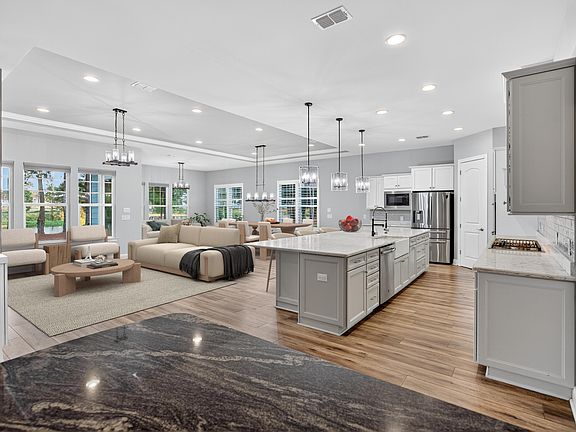 Welcome to 108 Bluff Isle Court, a stunning single-story lakefront home in the sought-after 55+ community of Four Seasons at Lakes of Cane Bay. Thoughtfully designed and *extensively upgraded*, this elegant 3,049 sq. ft. San Sebastian floor plan offers 3 bedrooms, 2.5 baths, and two garages accommodating 3 cars, all situated on a private cul-de-sac with peaceful east-facing views of the water.Step inside and you'll find 10-foot ceilings, tray details with crown molding, and an inviting open-concept layout perfect for entertaining. The gourmet kitchen is a chef's dream, featuring GE Profile appliances, double ovens, a five-burner gas cooktop, quartz countertops, a farmhouse sink, custom soft-close cabinetry, a vented hood, and pendant lighting over the oversized island. The great room centers around a modern, remote-controlled gas fireplace and flows seamlessly into the sunroom, where natural light and lake views fill the space. The owner's suite offers a luxurious retreat with a tray ceiling, spa-style bathroom with a frameless glass shower, soaking tub, soft-close cabinets, upgraded tile, and a custom-built walk-in closet complete with shelving and drawers. Enjoy year-round outdoor living on the extended paver patio, featuring a covered seating area with a ceiling fan, gas line for grilling, and a pergola with lighting overlooking the water. The garages are equipped with digital openers, 220-volt outlets, added lighting, and a mini-split HVAC system in the workshop bay, providing comfort and utility. Every inch of the home reflects careful attention to detail from custom blinds and plantation shutters to enhanced insulation and Sherwin-Williams Duration paint throughout. Beyond the home itself, Four Seasons at Lakes of Cane Bay offers one of the Lowcountry's most impressive amenity packages, including resort-style outdoor pools, a heated indoor lap pool and spa, pickleball and tennis courts, bocce, a fitness center, game and billiard rooms, a demonstration kitchen, ballroom, dog park, boat and kayak launch on the community's 300-acre lake, and 24/7 gated security. A full-time lifestyle director curates year-round events, and all lawn care is included, ensuring maintenance-free living at its finest. This home combines luxury finishes, functional upgrades, and a premium lakefront setting to deliver one of the most complete offerings in Four Seasons.