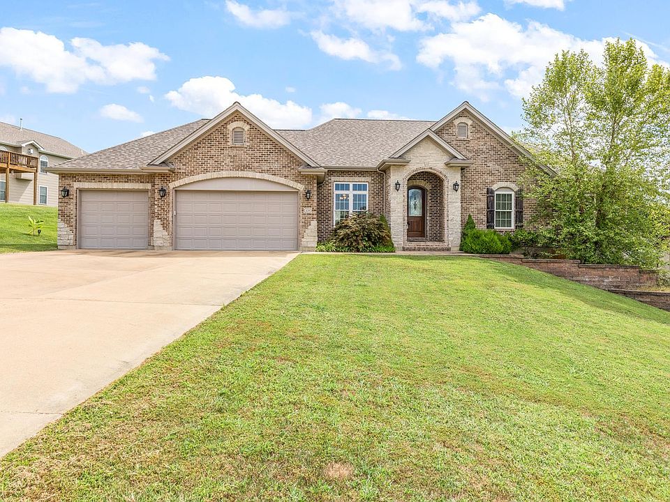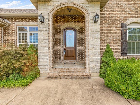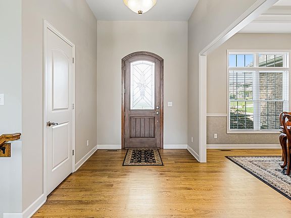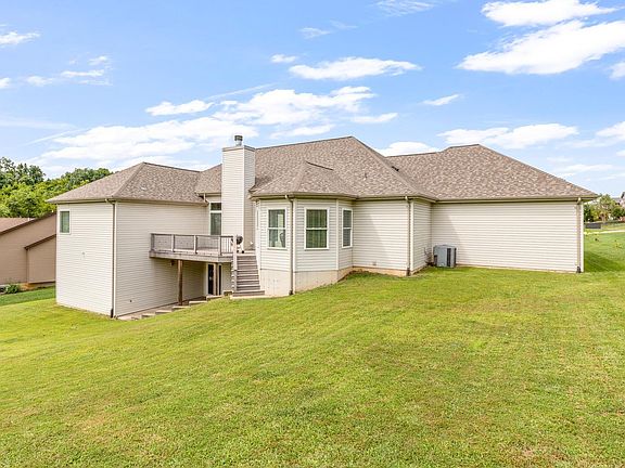 Exquisite ranch in the Vineyards at Bushberg. Custom, one-owner home is sure to impress! Entry leads to the great room w/ vaulted ceilings & woodburning fireplace w/ stone surround & mantle. Kitchen features custom maple cabinetry, crown molding, tile backsplash, under/in cabinet lighting, stainless appliances, gas cooktop w/ griddle/grill, built-in double oven, built-in microwave, island w/ bar seating, lrg walk-in pantry, eat-in kitchen dining, & ceramic tile floors. The entry, great rm, formal dining rm & master bdrm feature hickory blend hardwood floors. 3 bdrms on the main. Master bedrm has gas fireplace w/ built-in shelf above, coffered ceiling, his/her closets, full bathrm w/ jetted/heated tub, ceramic tiled stand up shower, & 2 single bowl onyx vanities. Lrg main floor laundry room just off entry of large 3 car garage w/ shelving & extra space for storage. Composite deck steps down to back yard. Walkout basement is a blank canvas w/ plumbing for future bath. Vault under porch.