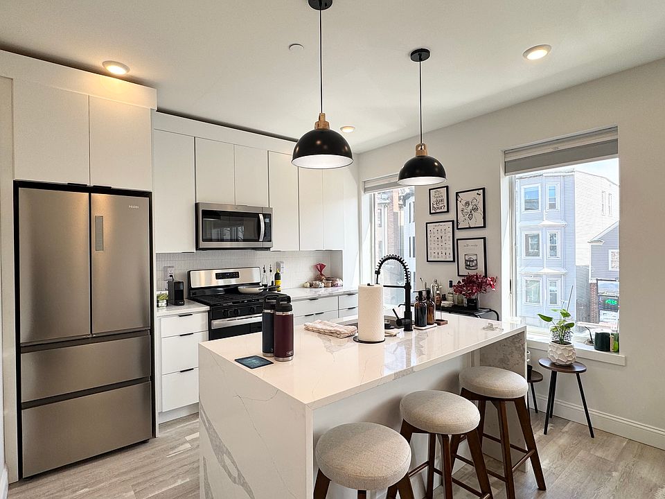 Available 9/1 Recently renovated 2bed 1bath unit on the 2nd floor in 108 Chelsea Street's lovely brick building. Unit offers open kitchen/living layout with private washer/dryer, central heat and air conditioning, plenty of light and spacious bedrooms. Blocks from Maverick Square MBTA blue line, new shops and restaurants, walk/bike path, including Bremen park. Owner pays for water/sewer. Tenant pays electric/gas. First month, security deposit, broker fee due at signing. Renter insurance required. Pets negotiable.