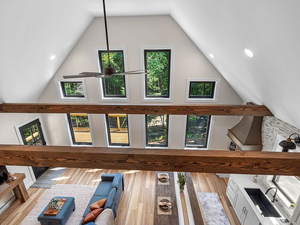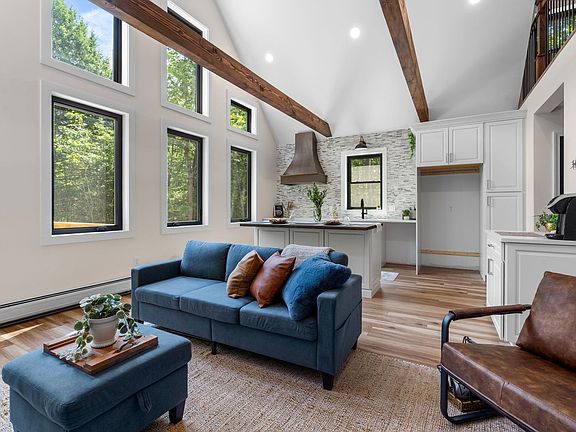 Welcome to your dream home—a meticulously crafted, 2025 new construction nestled on 7.34 private acres, just minutes from year-round recreation. Set back from the road for peace and privacy, this custom-built 3-bedroom retreat blends modern elegance with timeless Luxury Mountain-Inspired charm.Located just 3 mins from Newport Golf Club, 9 mins to Mount Sunapee Resort, and 11 mins to Lake Sunapee State Park, this home is a gateway to four-season adventures! Step inside to experience top-tier craftsmanship and designer finishes throughout.The open-concept living area showcases a stunning back wall of windows for natural light, custom-stained beams, rich hardwood staircases, and an inviting kitchen featuring quartz countertops, granite stone backsplash, and soft close cabinetry with crown molding. Black-on-black energy-efficient windows offer double-strength glass, multipoint locking systems, and in-view screens for both security and style.The luxurious primary suite features a spa-like tile shower with glass doors and marble-top vanities, walk-in closet and lots of natural light. Upstairs, you'll find two additional bedrooms and a full bathroom featuring a continuation of the upscale custom tile work. Enter the finished lower level with hardwood staircasing, pine board accent walls, built-in shelving, and walk out sliders to the backyard—ideal for a media room, additional living area, in home gym or guest space. The home is finished and a QUICK CLOSING IS POSSIBLE!