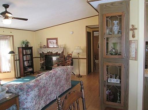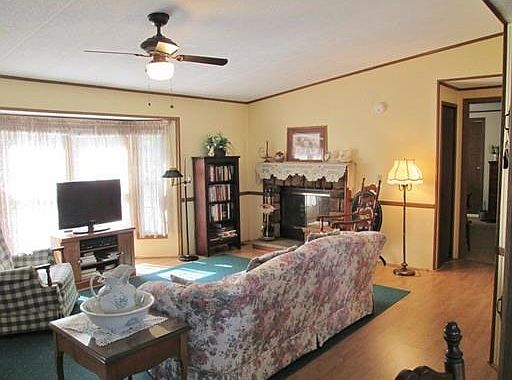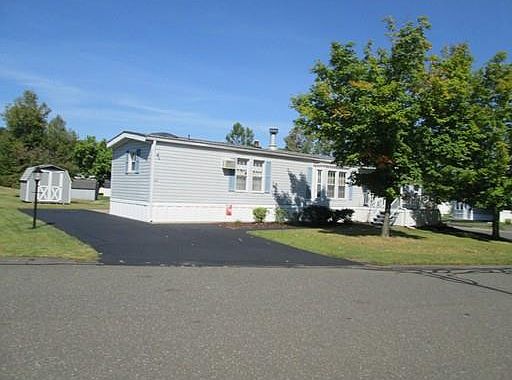 Just lovely DOUBLE WIDE mobile home at Brush Hill, with almost (1400 sf) of living space. So pretty sitting on the corner lot w/ covered front porch and side open deck. Open floor plan interior with living room offering cathedral ceiling and fireplace, 2 good size bdrms w/skylighted bath and the master bath w/whirlpool tub/shower, dining room w/slider to large deck, skylighted kitchen w/laundry room. You will truly appreciate the NEWER furnace, roof, large shed, bedroom carpeting and newly painted decks. Drive by.... I think you will agree.