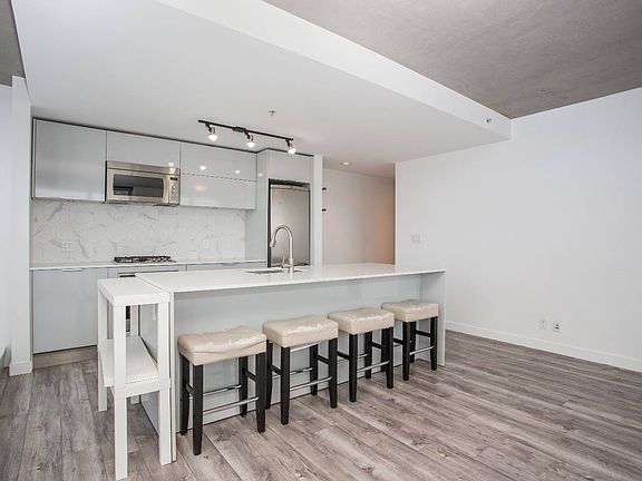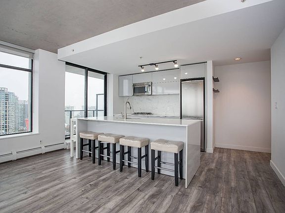 Welcome to your sky-high sanctuary on the 24th floor of the iconic Woodwards building! Located just steps away from the waterfront and Chinatown stations, as well as the vibrant shops and restaurants of Gastown, this 1 bedroom, 1 bathroom unit is a true gem. Featuring floor-to-ceiling windows that offer breathtaking views of the mountains, ocean, and city, this unit is sure to impress. With upgraded quartz countertops in the kitchen and bathroom, as well as sleek engineered hardwood floors throughout, this space exudes luxury. The modern kitchen is equipped with high gloss cabinetry and stainless steel appliances, perfect for whipping up delicious meals. The spa-like bathroom offers a deep soaker tub and a walk-in shower for ultimate relaxation. The spacious bedroom can easily accommodate a queen-size bed, providing a cozy retreat at the end of the day. For added convenience and enjoyment, residents have access to "Club W" - a stunning rooftop oasis with 360-degree views of Greater Vancouver. Whether you're looking to stay active with top-of-the-line fitness equipment or unwind in the outdoor hot tub, this amenity space has it all. With a fully equipped kitchen area, plenty of seating, and a relaxed atmosphere, Club W is the perfect spot to entertain friends or simply soak in the scenery. Don't miss out on the opportunity to call this incredible space your new home!