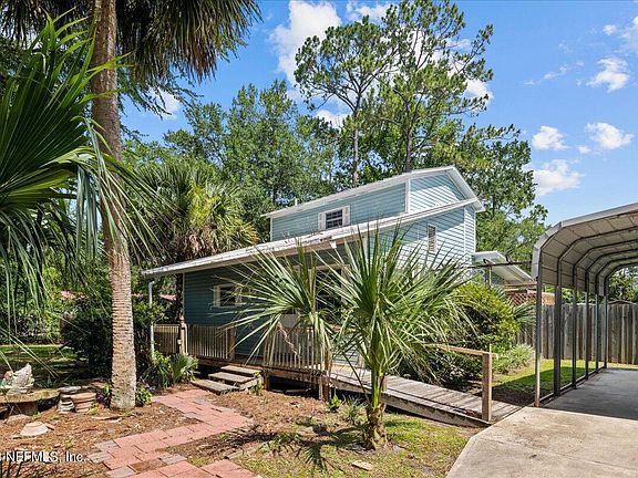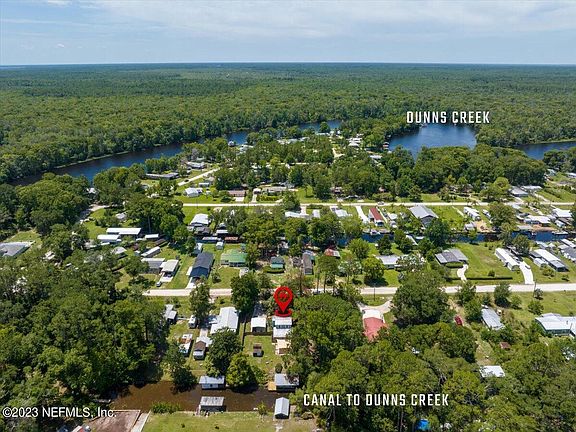 Cozy two story waterfront home on .56 acre with 130 foot of bulkhead on canal leading to Dunn's Creek off the St John's River. Best fishing and boating in the State. Featuring boat house with lift and a launch for family and friends. Outside the home has 2 porches, rear pavered patio, two outbuildings, double carport, metal roof, RV hookup, vinyl siding for easy upkeep and even an outdoor shower. Lot is fully fenced. Inside you'll find eat in kitchen with gas stove and a quaint breakfast nook, inviting family room and 1 full bed and tiled bath downstairs. Upstairs are 2 bedrooms and a water closet. Tankless gas water heater. Public sewer connected with public water in progress. This is the ideal short term rental, weekend and vacation home or full time living. Come on and see it, you will not want to leave!