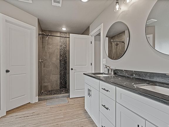 Separate showerEasy-care laminate floorsSoaking tubOpen layoutDramatic floor-to-ceiling fireplaceLarge fenced backyardStylish soapstone countertops
