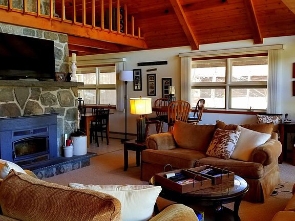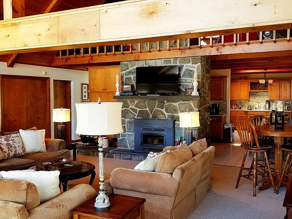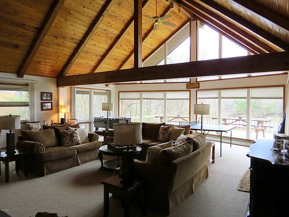 LAKEFRONT chalet on TANGLWOOD LAKE with pretty lake views - Featuring a gorgeous great room w/floor to ceiling stone fireplace, cathedral ceiling, updated kitchen and bar area w/granite countertops, dining area, 4 bedrooms, 2 full baths, sleeping loft, one bedroom w/brick fireplace, over-sized 1200 +/- sq ft deck w/great lake views and perfect for entertaining. Newly renovated main floor bath w/walk in shower, plus deep soaking tub, 2 bedrooms w/sliders to the deck or covered patio. Gentle walk down to your very own private dock. Over-sized 2 car garage. Tanglwood lakes community is located at LAKE WALLENPAUPACK with access to the power boating lake. Best of both worlds! Start enjoying the lake life! Sold mostly furnished and located with in a short distance to clubhouse and golf course., Beds Description: Primary1st, Beds Description: 1 BED 2nd, Beds Description: 2+BedL, Beds Description: 1Bed1st, Baths: 1 Bath Level 1, Baths: 1 Bath Level L, Baths: Modern, Eating Area: Dining Area, Eating Area: Modern KT
