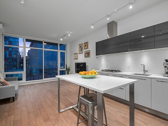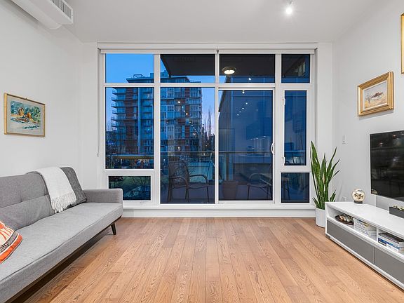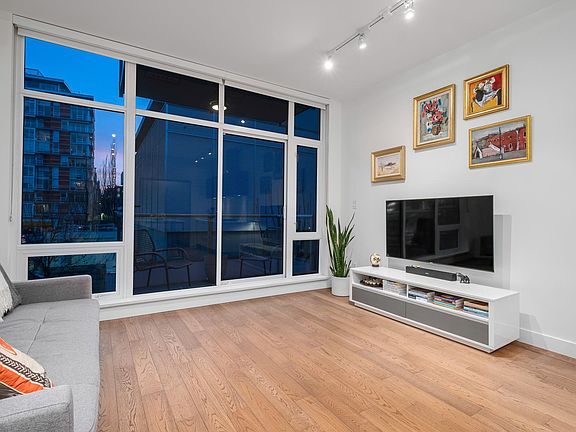 Welcome to Meccanica by Cressey. This south facing 634 sq.ft 1 bedroom features all the quality you've come to expect from a Cressey build. Including "CRESSEY'S" award winning kitchen design with a large center island, seamless quartz counters throughout, soft-close gloss cabinetry giving a sleek appearance whilst providing lots of storage, and Grohe fixtures. A king-size main bedroom, cleaned lined bathroom with white tiles that wraps the soaker tub. The unit has comfortable 9'5" ceilings & metal barn style door with a fully enclosed bedroom, hardwood floors throughout, 36 sq ft balcony that is tree lined with glass perimeter, air conditioning, 1 parking, and large 1 storage. Excellent amenities while enjoying Main st and Olympic Villages lifestyle. Rentals & pets allowed. Apt Only.