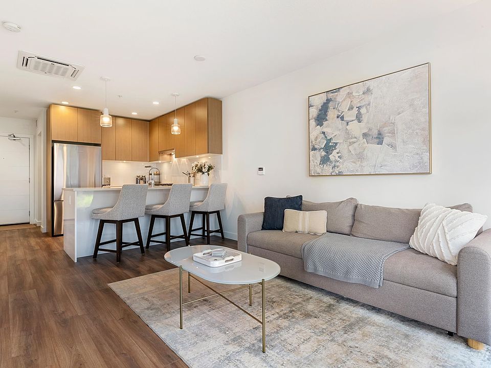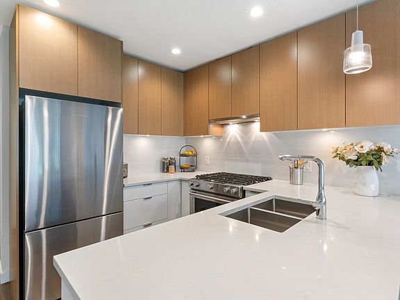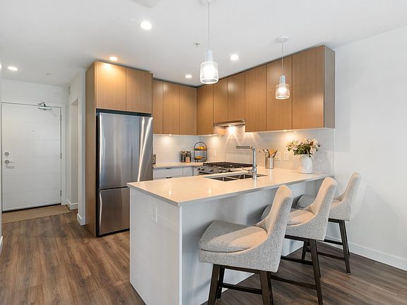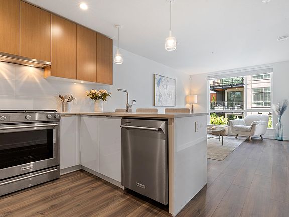 You really can have it all - Location & Style! This gorgeous 1-bedroom & den home at the coveted Crest by Adera feats. an open, light-filled living space with a well-appointed kitchen w/KitchenAid S/S appliances & gas cooktop; spacious living room w/ oversized window & balcony access; airy bedroom w/ two closets & large den w/ plenty of room for home office. Upgrades include A/C, bathroom tiles & closet organizers. Benefits incl. in-suite laundry, storage locker, full-sized EV parking stall, fitness centre, dog wash room & amenities room. You'll be steps to an amazing Dog Park, restaurants, cafes, parks, shopping - the best Lonsdale living has to offer - and minutes to the Sea Bus. Don't miss this opportunity for the perfect home or investment - right where you want to be!