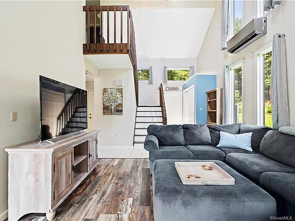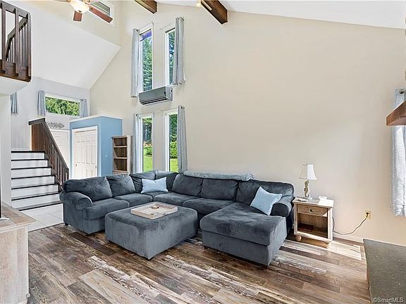Condo living with a private feel! Enjoy high ceilings, a floor-to-ceiling stone fireplace, and new flooring in this 2 bedroom, 1.5 bath condo. The living room is open to the kitchen, which includes a closed pantry for plenty of storage. The spare bathroom has recently been remodeled, and both bathrooms have new toilets. Additional updates include new doors, repainted siding and porch, and a new ductless split system provides heat and cooling for the entire living space. Custom gates enclose the back porch, which overlooks a tranquil pond. As an end unit, there is large yard space and plenty of privacy, plus you have the option of building an addition. There is an attached garage plus two additional parking spots. When you leave your calm oasis, a quick stroll will bring you to downtown Niantic, beaches, and the boardwalk. Call today for your chance to see this unit!