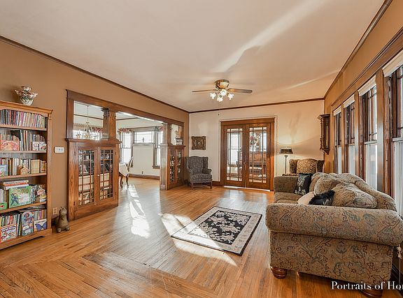 Style, charm and terrific curb appeal abound in this bungalow styled home. Find vintage character and modern touches from when you first enter the enclosed front porch. The generously sized living room features built in bookcases and french doors leading to a den that can also serve as an office. The spacious formal dining room has a stunning built in china cabinet and ample space for entertaining. The kitchen has been expanded to include a sunroom perfect for casual dining. Upstairs find 3 large bedrooms all with amazing closets and a remodeled bath. The basement features a family room, bedroom and bath area. The entire interior displays original millwork and hardwood floors that shows the pride of ownership. Welcome in spring with incredible patio with multi levels, walls and a captivating design. All of this on a beautifully oversized landscaped lot.