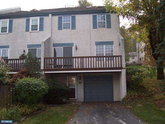 Great opportunity to buy a large Four bedroom end unit for the price of a three bedroom! Stone, stucco, three story townhome. One car garage. Freshly painted and carpets cleaned. Hardwood in LR, powder room, entrance and kitchen. Newer sliders and some windows replaced. LR with crown molding and gas fireplace. Kitchen with electric cooking, DW. Dining area and family room combo with sliders to deck. Newer CT hallbath, finished walkup attic. Basement has teak floors, two lg closets (one cedar), ceramic tile entrance from backdoor. Good-sized master, bath has lg walk-in shower. Hall bath updated with granite vanity and CT bath/shower. Washer & dryer on second floor. Other bedrooms have good closets. Gorgeous grounds and views from windows. Close to guest parking, playground and gazebo. Inside entrance to garage. A blank canvas awaiting your decorating touches!
