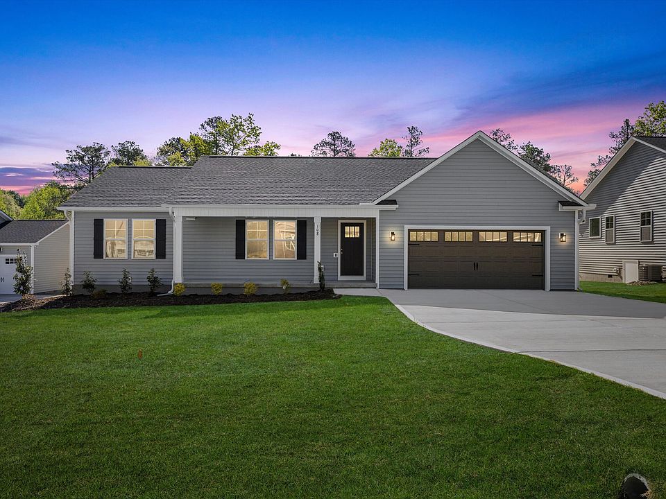 Welcome to your tucked away, tranquil oasis! This charming ranch-style home is nestled on the banks of a serene pond, offering breath taking views and a sense of peace and privacy. The property boasts numerous upgrades, including designer picked finishes, prewired security system, doorbell camera, granite countertops, and much more! Step inside to find open living with vaulted ceilings creating an airy ambience with an abundance of windows for natural light and POND VIEWS! Your primary is grand with an accent wall, custom walk in closet, dual sinks and a walk in tiled shower! 19 miles to Fort Liberty for an easy commute!