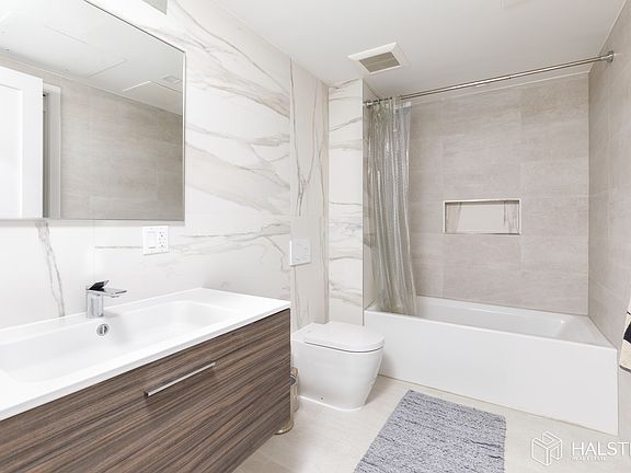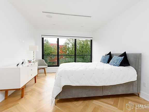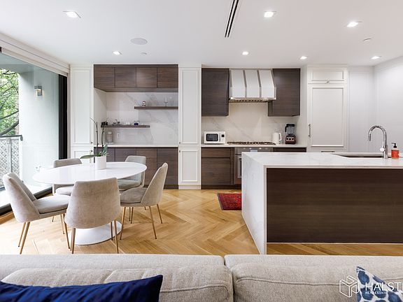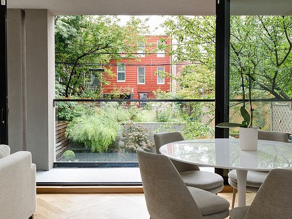 Boutique Condo duplex in fashionable Greenpoint Brooklyn, on the most beautiful tree line block. Live in luxury in this superbly designed home, feeling as if you are residing in your own private townhouse. This architecturally mastered 1719 sf, 3 bedroom & 3 full bath space offers a large open plan living room with fireplace and dining room that is perfect for entertaining, oversized floor to ceiling windows to let in an abundance of light, stunning open chef's kitchen and wonderful, large outdoor space that overlooks beautiful greenery. The kitchen is stylishly designed with smoked walnut & white custom cabinetry, Calcutta Venice polished quartz countertops, Thermador stainless smart appliances, a waterfall peninsula island, and a built in dining buffet. The lower level of this home also offers one bedroom with access to a glass enclosed Juliet balcony and a full bath you can access through the main hallway or bedroom. The entrance hall includes a laundry room with a full size Electrolux washer and vented dryer as well as multiple, sizeable custom made closets, perfect for all your storage needs. As you walk up the glass staircase to the second level you will find an amply sized South facing second bedroom and a full bath decorated with Walker Zanger white natural porcelain tile. On the second level you will also find the elegant master bedroom with oversized sliding glass windows, a walk-in closet and a lavish master bath in Bianco Bello polished slabs, Arizona tile set in a herringbone pattern and a floating vanity with waterfall marble and fixtures in dark platinum matte. Additional features include Herringbone wood floors, high-quality crafted picture moldings, and a central heating & cooling system and a sound system. Low monthlies, a sophisticated facade design, bicycle storage, Ring doorbell system and ADT security system make this wonderful home one you will never want to leave. Close proximity to many restaurants, boutiques, and all transportation (subway on the same block and less than 20 minutes to Manhattan).