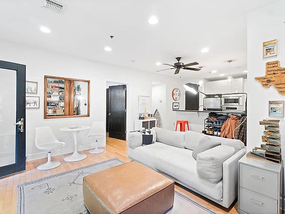 Through the French doors you'll find your private terrace, offering a serene retreat in the city. The generously sized bedroom provides ample space for relaxation and storage. Plus, enjoy the convenience of an elevator and a coveted private garaged parking space for 1 car.
