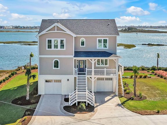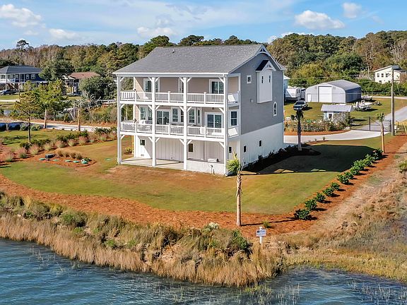 Nestled on a rare, private peninsula, this exceptional new construction home offers unmatched water views of the Intracoastal Waterway, Topsail Island, and the Surf City Bridge—just moments away. From the moment you step through the front door, you're greeted with panoramic water views that make you feel like you're on vacation every day. This is a rare opportunity to own over half an acre of prime waterfront property with incredible privacy and space between homes, ensuring that your tranquil sanctuary remains uninterrupted. The expansive views stretch from the Surf City Bridge to the serene waters of the Intracoastal Waterway, with Topsail Island in the distance. The home is designed to capture every aspect of these breathtaking vistas, making the water feel like an extension of your living space. A private, gated entrance ensures that this exquisite home remains a peaceful, secluded retreat. Located on the main living floor, the oversized owner's suite features stunning water views, a luxurious en suite bath, and direct access to a private balcony overlooking the water. A perfect spot to unwind at the end of each day. Upstairs, you'll find three additional suites, each offering breathtaking views. One suite overlooks the canal, while the other two open to a third-floor balcony that offers a truly breathtaking panoramic view of the waterway—perfect for sunrises, sunsets, or simply enjoying the beauty of the surroundings. The home boasts 4 spacious bedrooms, plus a dedicated study that can easily function as a 5th bedroom, making it perfect for families or guests. With 4.5 baths, there's ample space for privacy and comfort. A community dock shared with only one other home offers easy access to the water for boating and fishing. There's also a boat ramp for convenience. This home has been thoughtfully designed with features like an elevator, outdoor kitchen, and composite decking—perfect for coastal living. The home includes a 4-car garage with with space for toys