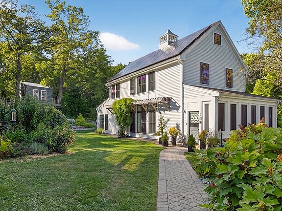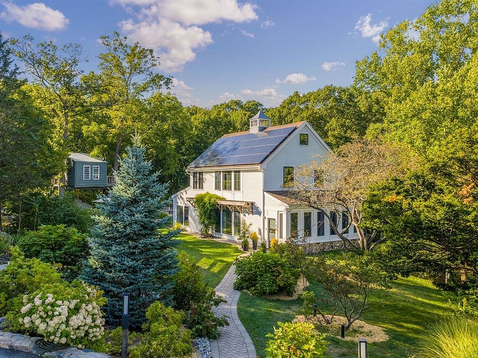 Stunning modern farmhouse designed by A3 Architects as a sublime retreat for a family of 5. Built in 2014 & barely visible from the street, the home’s East-West axis maximizes southern exposure for 28 owned solar panels & main rooms sit along south facade to receive maximum passive solar gain. Super insulated 12” exterior walls reduce H/C needs & add interior quiet. Open concept main living/dining features large Marvin windows & 1st floor primary suite w/ spa-like bathroom & private patio. Upstairs, find 3 large bedrooms, a full bath & flexible homework/TV/workout area. Hardie board exteriors. Large 1.36 acre lot, wired for Husqvarna automower, features a treehouse, fenced garden w/ 6 raised Vego beds, shed, & drip irrigation for unique & mature trees, grape arbor & pollinator-friendly plantings. Meticulous premium upgrades, new full-house H20 filtration system & Miele W/D, complete this serene, nature-friendly family oasis. Short distance to commuter-rail/short drive to Ferry.