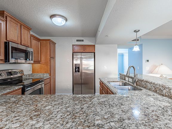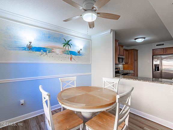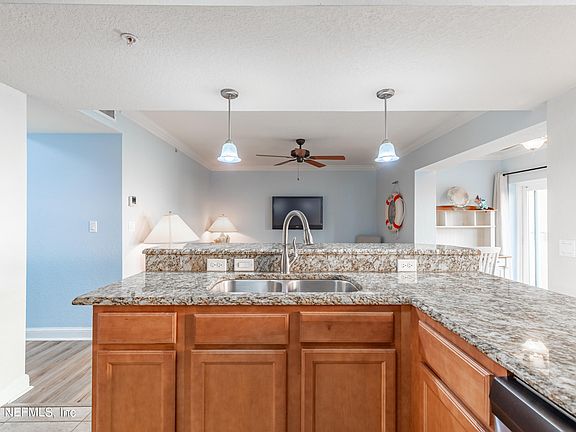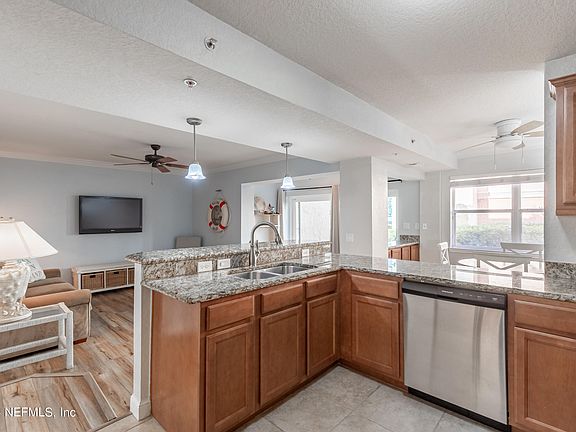 For beach lifestyle living at it's finest you are going to fall in love with this immaculate 1 bed- room/1 bathroom first floor/corner condo. Walk out the backdoor and walk 40 steps to the resort style pool and waterfront relaxing area to watch the sunset in the west. The white sand of the beach and blue ocean are only a 4 minute walk away from your front door. Beautiful granite countertops & stainless steel appliances in the kitchen along with under the cabinets lighting. Newer waterproof plank vinyl laminate flooring and a new easy to slide $7,000 sliding glass backdoor. You'll have full access to the clubhouse, weight room, and summer kitchen for throwing parties for your friends and family. From pizza to fine dining you will be mere minutes away. Double sinks in the bathroom with shower/tub. Parking space #230 included plus 1 extra parking permit. Definitely the very best value in all of Jax Beach! Sliding glass door has a transferable lifetime warranty. (continued) Condo fees covers home owner's and flood insurance. Condo has it's own over/under washer/dryer unit.
