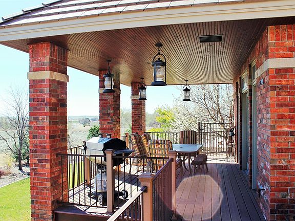 Breathtakingly beautiful, 1 1/2 story home on the lake in Cimarron, Ks. This high quality, custom built, one owner home is your dream come true. Full brick w/ limestone accents & professionally landscaped yard give this home great curb appeal. The majestic front porch welcomes visitors into the stunning 2 story foyer w/ a beautiful curved staircase. The living room with W/B fireplace is open to the kitchen & dining area which boasts floor to ceiling windows overlooking the serene backyard & lake. The kitchen is a chef's delight w/ a stylish gas cook top, double ovens, separate prep counter w/ sink & a walk-in pantry. Enjoy the walkout basement with large family room/rec area & w/b fireplace, wet bar, theater room & gun room/office. This home w/ 5 bedrooms, 5 full baths & 2 half baths will serve all your needs. Special finishes include arched doorways, Knotty Alder woodwork, Travertine tile, in-floor heat in basement & master bathroom, built-ins throughout.