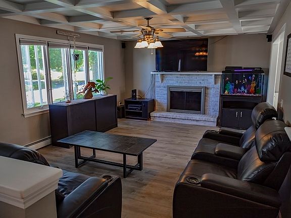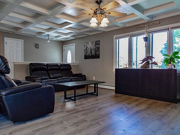 - Features: Coffered Ceiling(s), Flooring - Laminate, Open Floorplan, Remodeled, Slider, Wainscoting, Lighting - Pendant