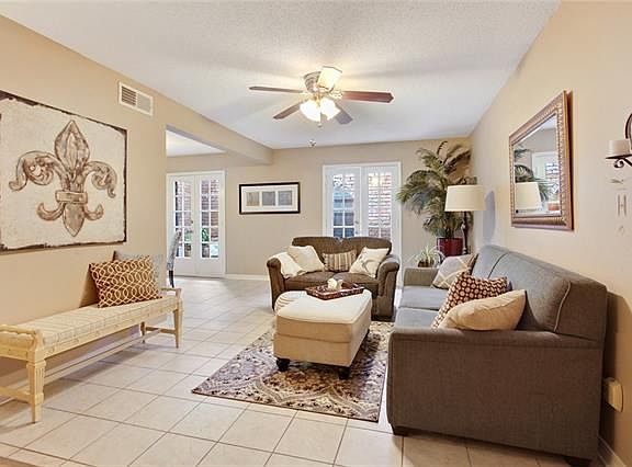 You'll love this hidden gem in Bucktown. French Quarter style at a Metairie price! This lovely 2 bedroom, 1.5 bath Townhouse boasts large bedrooms with cathedral ceilings and a private balcony, an open living and dining floorplan, spacious kitchen with eat-in counter, indoor laundry and tons of storage space. French doors open to a quaint patio with lots of privacy. Covered parking space with additional driveway parking for guests. The property has never flooded. Act quickly, this won't last long.