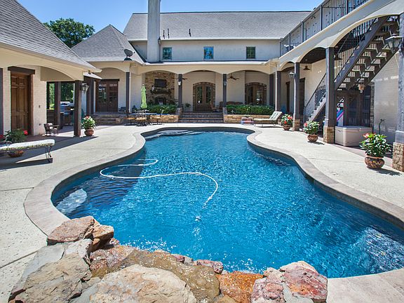 Entertainers Delight!! This custom built, one owner 4769 square foot home has everything you've ever wanted and more! Incredible water views from all three bedrooms and the mother in law apartment/pool house. Office, bonus room and a safe room that is bullet proof and will withstand an F5 tornado. Gorgeous hand rubbed wood and travertine marble floors throughout with soaring 24 foot ceilings. Kitchen with Wolfe 6 burner stove, built in sub zero refrigerator and sub zero freezer, double ovens, Bosch dishwasher, trash compactor, granite island, custom wood cabinetry and large walk in pantry. Formal and informal dining areas. Spacious master suite with walk in wrap around closet. Second floor has two additional bedrooms with jack and Jill bath. Upper loggia has an exercise room and a game area. Fairly new roof and fresh paint throughout. Outside you'll find an outdoor fireplace with sitting area , covered patio, outdoor kitchen with ice maker, and swimming pool with rock waterfall. Relax around the fire pit or fish from your own private pier for bass and brim in your lake or one of the other three in the neighborhood. Oversized three car garage with huge store room/workshop and extra parking in the front and side of the home. This one is truly a show stopper with 3.5 acres. Professional pictures coming soon!