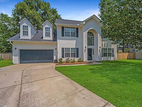 Located at the end of a quiet cul-de-sac in Crowfield Plantation, this open & bright floor plan has beautiful upgrades top to bottom. The foyer shines with a stunning 2-story arched window, 12+ ceilings, upgraded light fixture, & new floors throughout the downstairs. A large modern kitchen with quartzite countertops, tile backsplash, & stainless-steel appliances are illuminated using recessed lighting that can be dimmed to fit any occasion. The kitchen enjoys a wonderful view of both the living room & fireplace. All bathrooms are upgraded with quartz countertops, tile floors, & new fixtures. The large master bathroom includes a walk-in closet, dual vanities & a deep soaking tub with a separate glass shower. A new roof was installed in 2020, new water-heater in Feb. 2023, & HVAC is newerOutside is a large backyard surrounded by a privacy fence where mature trees provide a canopy of shade. The spacious backyard has a fire-pit and patio with plenty of space for entertaining, BBQing, and relaxing with family & friends. Crowfield Plantation is near shopping, schools, and restaurants. The home is approx 10 miles to the Navy Weapons Station Joint Base in Goose Creek; & approx 13 miles to Charleston Airport.