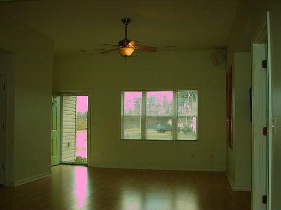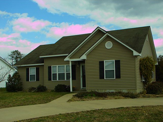 CUSTOM BUILT with lots of upgrades! Features open greatroom/dining/kitchen; greatroom has 10 ft. ceilings and laminate floors and kitchen has tiled floor and appliances and eat at bar; nice utility room with tiled floors; 3 bedrooms (split floor plan); master has laminate floor and bath is tiled, double sinks and garden tub. HVAC updated approx. 3 years ago. Surround sound w/7 speakers and tv convey. Storage building and hammock also convey. Circular driveway on corner lot. Perennials, blueberry bush, fig tree and peach tree. MOVE IN CONDITION.