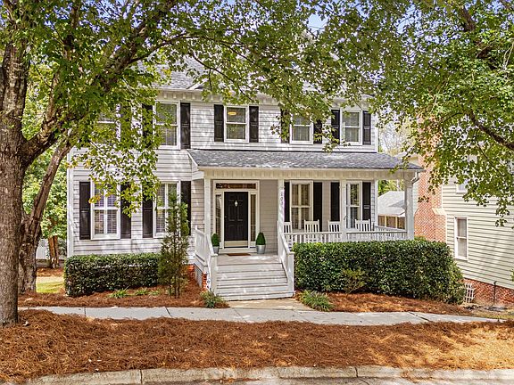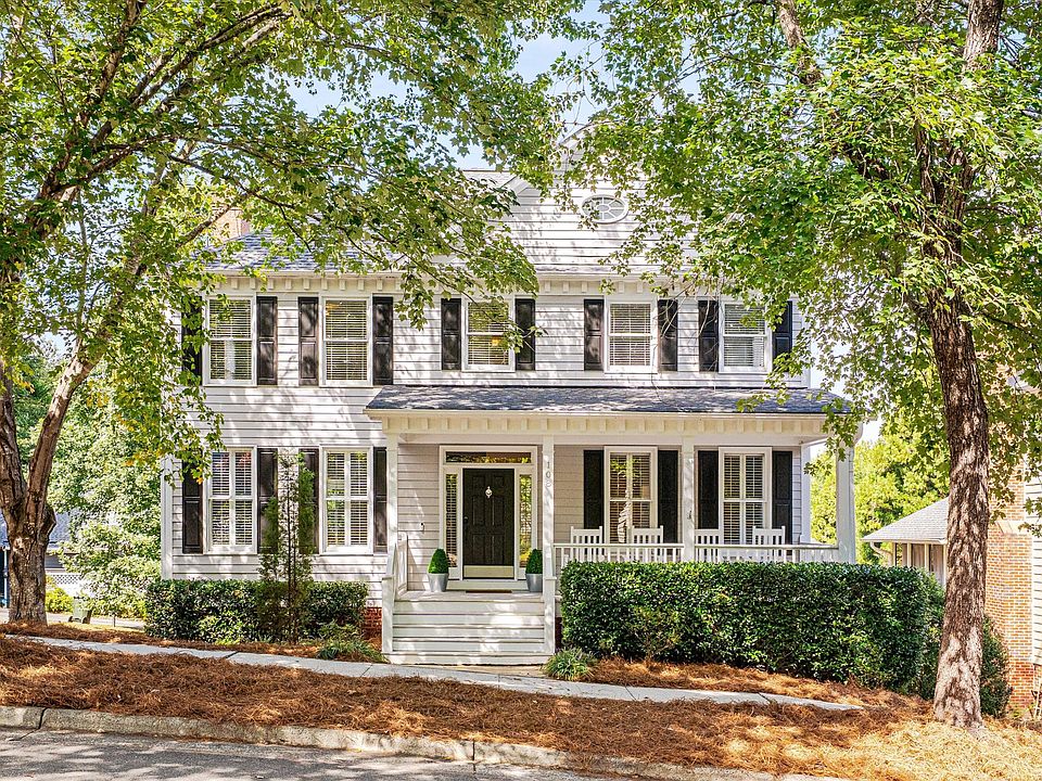 The pleasure of Meeting! Rendezvous at this renovated and impeccably maintained stylish home in Southern Village. Smart architecture greets amidst the charming, leafy streetscape. Classic and collected, the interior gives traditional a fresh twist with a layout offering a sequence of flexible spaces that feel warm and inviting. A lounging zone, the kitchen opens to the dining and family room with a focal brick fireplace. Natural hardwood floors, curated lighting, two walls of custom built-ins, French doors, stone counters, stainless appliances, a calming palette, and golden light are an ode to refined simplicity. Join family in the sunroom to cheer on the Tar Heels on the built-in big screen. The primary bedroom is particularly peaceful with a trey ceiling, spacious walk-in with custom closet system, and renovated bathroom with carefully-considered serene tones of ceramic tile, double stone vanity, and a seamless glass shower surround. Secondary bedrooms share an updated hall bathroom that refreshes with a harmonious blend of tile, fixtures, and vanity with stone top. The lower level flex room could be a fourth bedroom, with an adjacent full bathroom, or recreation space. Walk-up attic for easy storage or expansion space. Newer roof and HVAC. Idyllic location a hop, skip, and jump to Meeting St. play park, a beloved spot for slides and make-believe. Fancy Meeting friends at all the village faves - market, movies, munchies and more - plus just-over-a-mile to UNC. This Meeting will fulfill your wishlist.