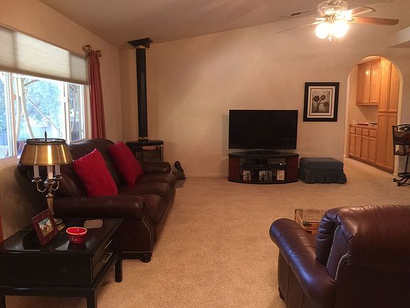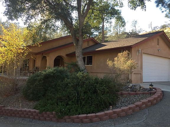 This Gorgeous Home is on 3.29 Acres with an irrigation well and 3 bedrooms 1.75 bath. Lovely landscaping and park like setting with a seasonal creek in front of property. The home was built in 2005 and has an open floor plan with large kitchen area looking out at living room and dining room. Free standing propane stove keeps the home comfortable in the winter and there is also a forced air furnace. Ceiling fans throughout, built in cabinets in 2 of the bedrooms. Newer lovely shower in hall bath and master suite has a jetted tub, double sinks, walk-in closet, and door to covered porch. The porch is truly wonderful - beautiful views and peaceful. Circular driveway around the home and lots of room for toys. And the best part - a well for watering the 3.29 acres!! New pump and plumbing for well 3 yrs ago. Lots of trees! Sprinkler system, laundry room with wash basin. RV hookups at back of home. Fenced Dog Run. 220 outlets and Christmas tree outlets outside! This is a well thought out home with lots of amenities and a Gorgeous Setting.