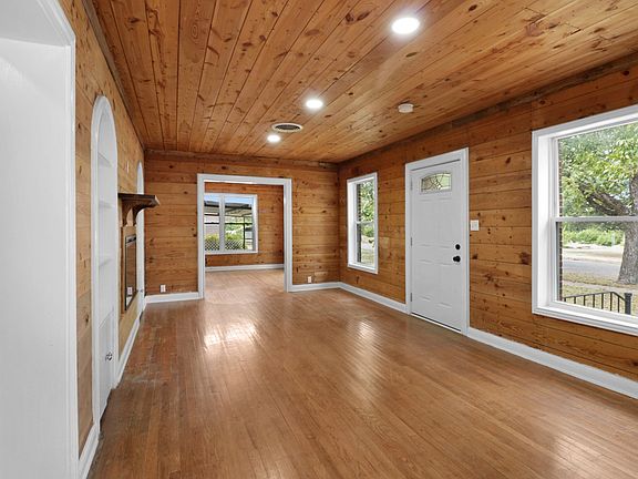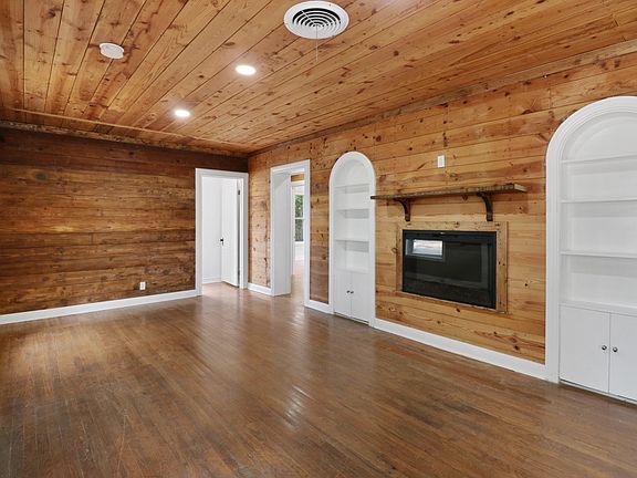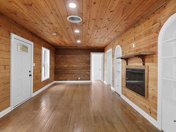 Step inside the front door to the cozy living room, where rich hardwood floors, natural wood plank walls, built-in cabinets, and an electric fireplace with mantle create a warm and inviting space. From here, three roomy bedrooms branch off, each filled with natural light from generous windows and offering nice-sized closets. A guest bath in the hallway includes a tub and shower combination, single-sink vanity, and built-in shelving.