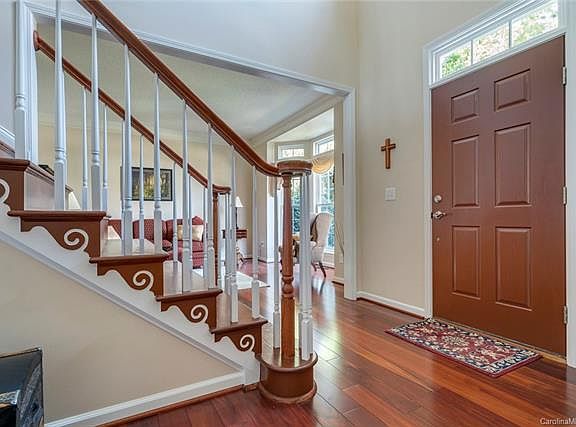 Fort Mill, SC home that is full of charm and character! Featuring a formal sitting room; formal dining room; office/bedroom; sunroom; mud/laundry room; and an open flow between the large kitchen and living room. We love the hardwood floors with decorative accents throughout the main floor, and the built in book shelves that frame the gas log fireplace in the living room. The kitchen has a center island with space for bar stool seating, plenty of counter and cabinet space, stainless steel appliances, and a separate wine/coffee bar! Upstairs there are 4 large bedrooms that share a full bath. The over-sized owner's suite features trey ceilings and a beautiful tiled ensuite with dual vanities, garden tub, glass shower, and a walk in closet w/ built in custom shelving. Bonus room ft. unique walk-in attic space above the 3 car garage! Enjoy time out on the patio that overlooks a very private, flat backyard. Knightsbridge neighborhood is zoned for the Top Rated Fort Mill school district.