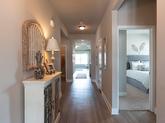 This Rhett Plan is ready for move in. 9'ceilings throughout, luxury vinyl plank flooring throughout the main areasand carpet in the bedroom. This home added details of tray ceilings in living room and master bedroom, brushed nickel hardware, granite countertops, and elegant doors. The kitchen has a center island, a nice size walk-in pantry and the appliances include smooth top range, microwave and dishwasher and Kinetico water filtration system. An open kitchen to theliving room and dining area, makes this home perfect for entertaining. The master suite has as nice master bath with walk-in closet, garden tub and separate shower.