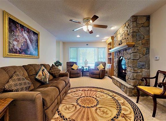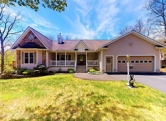 SPACIOUS POND FRONT CONTEMPORARY RANCH WITH COUNTRY COVERED FRONT PORCH ON .64 ACRES!This home has so much to offer a family looking for lots of space. Featuring Master BR with private en suite bath, Large eat in kitchen with appliances, Living room with built-in shelving and stone propane fireplace, bedroom #2 with private deck. Part finished walkout basement with 5th Bedroom, 3rd full bath, family room, storage utility room and ground level door to stroll out to the pond. Additional features include 4 Season Sun Rm with sliders to 2 of the bedrooms and 1 to the dining area. Head on out to the oversized deck with covered hot tub area overlooking the pond. Close to amenities and Elm Beach. Bring the whole family enjoy and relax!
