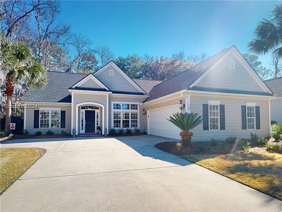 Discover this charming single-story home located in the sought after gated community, The Crescent. This immaculately maintained home is poised on the golf course in a private cul-de-sac. The home's features include 3 beds & 2 baths, den/office, an open floor plan with a dining room, eat-in-kitchen & a 2-car garage, perfect for modern living. The kitchen, with stainless steel appliances, seamlessly flows into the living areas. Outside, a private oasis awaits: a brick patio under a pergola with golf course views. Convenience to shopping, restaurants, entertainment & nearby Hilton Head beaches adds to its allure. A true gem!