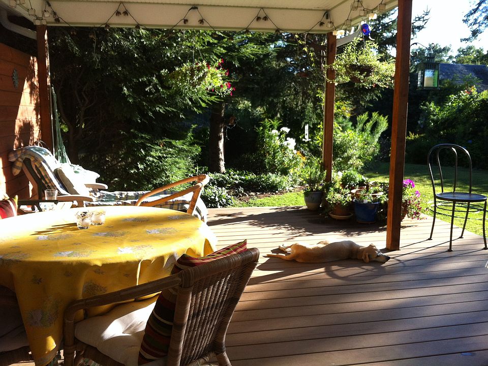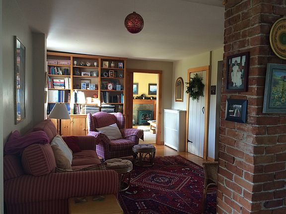 Farmhouse style, open plan family room, sun room, dining area and kitchen leading to a covered south facing porch and garden. Separate living room with fireplace, 3 bedrooms upstairs with a bathroom. Separate in law apartment above a 2 door garage and workshop. Beautiful, sunny with open plan kitchen and dining area leading to a spacious living room with a fireplace, vaulted ceilings and skylights. South facing deck outside.