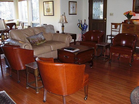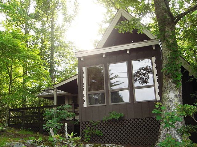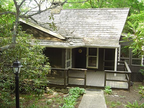 Mountain style home on level lot offering two bedrooms and two baths, with large eat in kitchen, loft for office or third bedroom, wood floors on main level living and sun room connecting to the living room. The main great room area hosts a native stone fireplace which has been converted to gas. The home has central ac and the roof is approx 5 years old. There are large windows and the home has good light infiltration. There are two decks - one in the front of the home and another on the back side for more privacy. The lower level has a golf cart parking garage under the home.