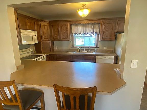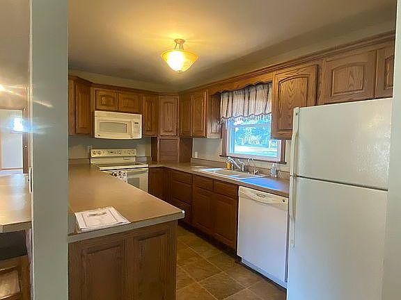 Ammenities include: Quiet neighborhood , close to village park , city sewer and private water well. Family room with vaulted ceiling , updated kitchen with custom built cabinets and open wall passthrough with bar seating , laminate flooring , dishwasher , microwave, refrigerator and stove included . Separate laundry room / utility room with water softener and 15 SEER 18,000 BTU electric Heat Pump forced air with central A/C (New in 2013). Original plaster walls and ceilings with no cracks or damage.Original oak hardwood floor in living/dining room. Updated vinyl widows , soffit and facia. 2 concrete driveways for plenty of off street parking , concrete sidewalks , covered porch with swing to enjoy sitting outside on summer evenings , Spacious 24x36 insulated pole building / detached garage with blacktop public alley access from street featuring concrete driveway, concrete floor, 2 parking bays with overhead doors and openers ,plus extra storage/work space . This is a well built 1 owner home since 1955 and has been well maintained and cared for many years . They don't build them like this anymore!!