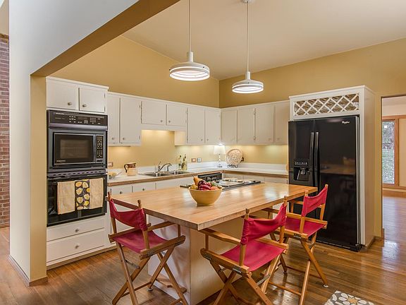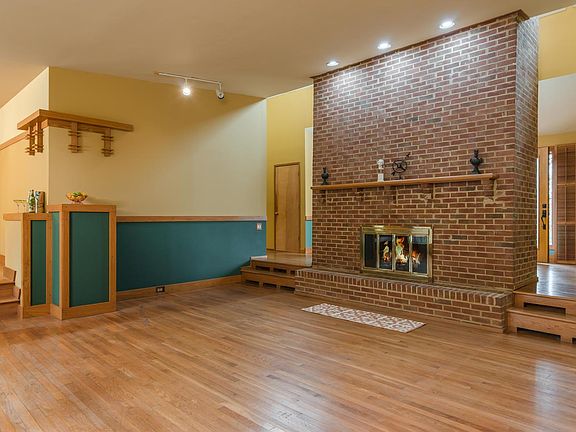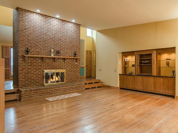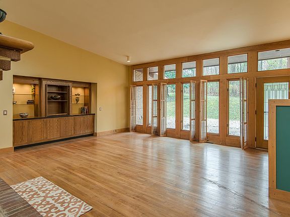 Cool Frank Lloyd Wright inspired Contemporary! Hardwd floors, tons of built-ins, new master closet by Closet Co. Private lot w/lovely views, Walls of windows, big fireplace in LR, Sep DR, 2-car garage. Needs some updating. Priced under appraisal..