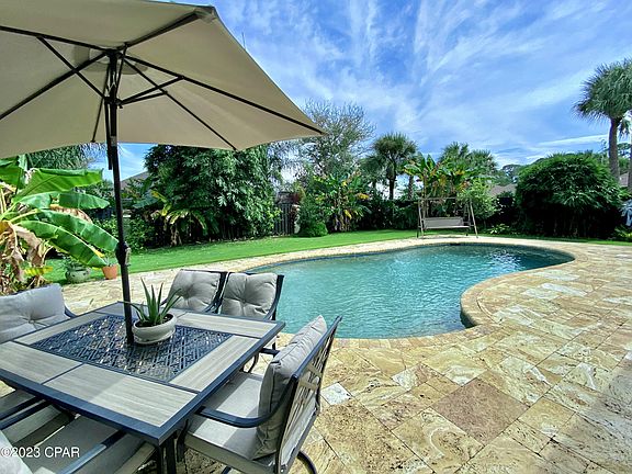 *CURRENTLY UNDER CONTRACT, SELLER WILL CONSIDER BACKUP OFFERS* Best deal on a beautiful POOL HOME, 5 minutes from the BEACH! 3 bedrooms, 2 baths, BONUS ROOM & heated/cooled garage. Open floor plan, high ceilings, huge windows, wood floors throughout, gas fireplace & stove, renovated bathrooms. Very private back yard, custom pool with travertine stone patio. Zoysia grass, fruit trees & exotic plants. Solar panels save hundreds of dollars every year on electric bills! Home includes a greenhouse, geothermal H20 heater & storage shed. 5 min to restaurants, entertainment, activities, St. Andrews State Park & the Gulf of Mexico! SO MUCH VALUE in this home! All information is approximate and should be verified by buyer if important.