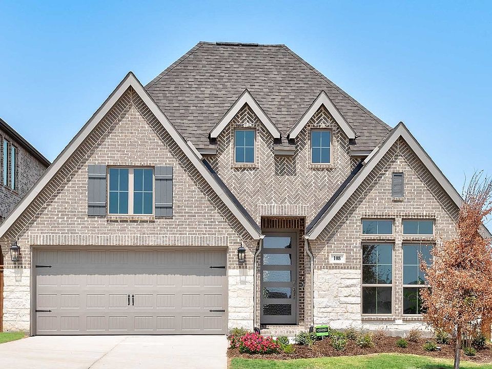 Home office with French doors set at entry with 12-foot ceiling. Coffered extended entry leads to open family room, kitchen and dining area. Family room features wall of windows. Kitchen features corner walk-in pantry and generous island with built-in seating space. Primary bedroom highlights 12-foot ceiling and wall of windows. Double doors lead to primary bath with dual vanities, garden tub and separate glass-enclosed shower with separate walk-in closets. A guest suite with private bath adds to this one-story design. Covered backyard patio. Mud room off two-car garage.