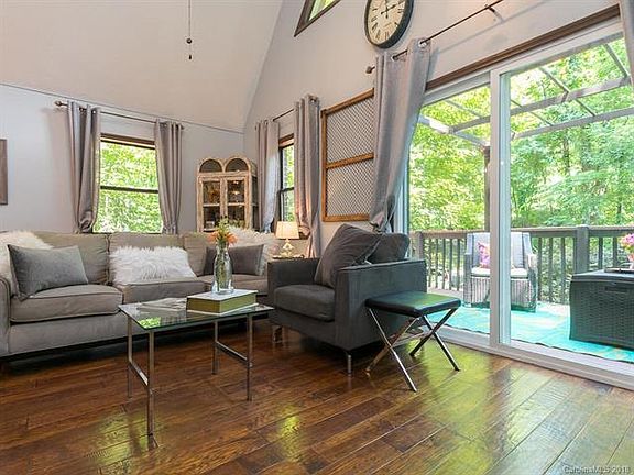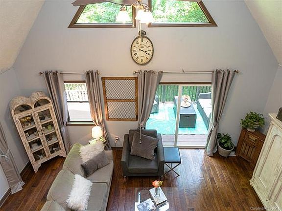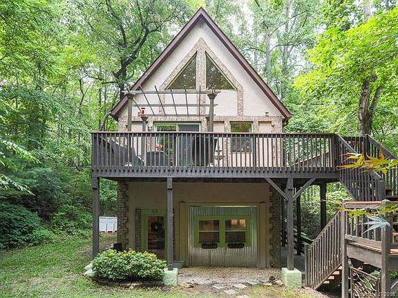 This is your perfect treehouse get-away or vacation rental dream! Move right in to this awesome updated "A frame" chalet nestled in the trees on a large private lot. The open plan and high ceilings brings in lots of light on each level. An open living/dining area has a cathedral ceiling and hand scraped hardwoods that continue throughout the main and upper level. The master feels like a tree house and features a private balcony and walk in closet. The lower terrace level has super high ceilings, a cool loft decor with big sliding barn door, and more room for expansion, if desired. With a separate, easy access entrance, it would also be a great spot for a home based business or in-law suite. The huge wrap around deck is perfect for entertaining and taking in the winter mountain views. Great location is convenient to the hospital and easy highway access, but tucked away on a quiet non-through street. Lots of storage too!